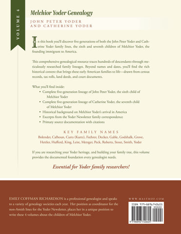In this book you’ll discover five generations of both the John Peter Yoder and Catherine Yoder family lines, the sixth and seventh children of Melchior Yoder, the founding immigrant to America. This comprehensive genealogical resource traces hundreds of descendants through meticulously researched family lineages. Beyond names and dates, you'll find the rich historical context that brings these early American families to life—drawn from census records, tax rolls, land deeds, and court documents.
