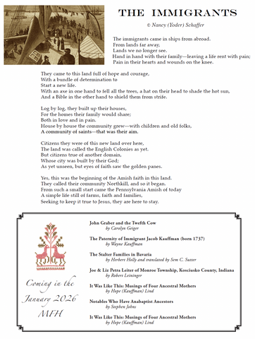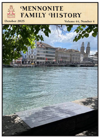 This issue contains the following articles and [surnames]: Bavarian Amish Mennonites by Lemar and Lois Ann (Zook) Mast; 500th Anniversary of Anabaptism, 1525-2025 by Lemar and Lois Ann Mast; Early King Family Frakturs by Isaac L. Beiler [King, Blank, Fisher, Stoltzfus]; Lodging State Censuses in Your Family History Research: Jacob T Wenger and His Family in the 1925 Iowa Census by Renee (Love) Cue [Wenger]; Martin Samuel Weaver: Kansas Homesteader by Dr. Jeffrey and Sharon (Weaver) Vitter [Weaver]; The Brown Bungalow by Hope (Kauffman) Lind [Gascho]; 105 Years of Amish Mennonite Families on the Barbelsteinerhof in the Southern Palatinate, 1687-1792 by Herbert Holly and translated by Sem C. Sutter [Holly, Ringenberg, Kiefer, Hochstetler, Esch]; Mifflin County Mennonite Historical Society compiled by Lois Ann (zook) Mast with the assistance of the MCMHS Staff [Hartzler, Yoder, King, Zook, Kurtz, Peachey, Miller]; Five Branches of One Ropp/Rupp Family in Ontario by Bruce W. Jantzi [Ropp/Rupp/Roub/Robb/Roppe, Schweitzer, Eyman, Maurer, Richard, Eicher, Neuhauser, Roth]; Immelhauser Hof compiled by Lois Ann (Zook) Mast [Oberholtzer]; Will of Hans Bucher (1681-1762).