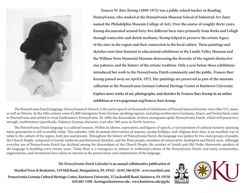 This year's calendar features the barn star paintings of Frances W. Barr Kremp (1899-1972), a public school teacher in Reading, Pa. For over thirty years she documented different barn stars primarily in Berks and Lehigh Counties through watercolor and sketch mediums. Kremp helped to preserve the artistic legacy of the stars in the region and their connection to the local culture. As a bilingual calendar, all of the text is in Pennsylvania Dutch and English for ease of use in families that wish to explore their Pennsylvania heritage. (28pp. full-color illus. Masthof Press, 2025.)