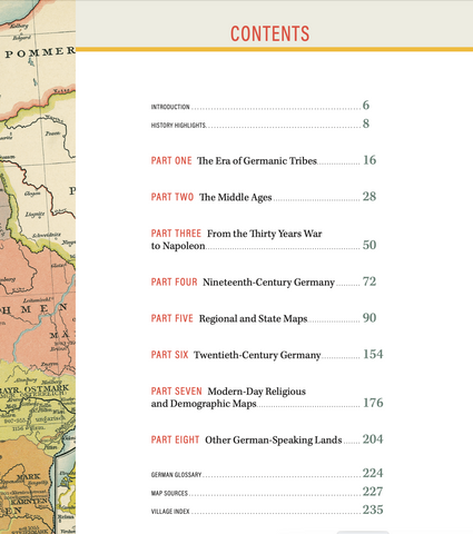 This carefully curated collection of beautiful historical maps of Germany will help you sort out the mess that is German history. With these 100+ full-color maps, you can view German border changes throughout the centuries, allowing you to find your German hometown and records of your ancestors. Includes maps of German states from medieval times to the present; extensive histories of Germanic regions from the Holy Roman Empire to the Berlin Wall; and timelines of the events in each era of German history that affected boundary changes. (235pp. full-color illus. Masthof Press, revised 2nd edition 2025.)